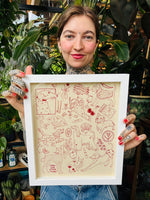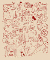 For the first time, Abbie’s iconic flash sheets are available as artworks exclusively at They Made This. Printed in deep red on an off-white background, this piece features dogs and playful motifs, full of charm and humour. True to her style, it’s rich with detail — there’s always something new to discover.