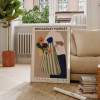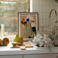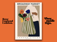 OTHER INFORMATION From Rose's 'London Collection' capturing the essence of the city's most iconic spots. This particular piece draws inspiration from Broadway Market, where Saturdays are filled with colourful flowers, fresh produce, and delicious treats. Embrace the market’s spirit with our high-quality fine art print that showcases a striped tote bag, brimming with blooms and farm-fresh goodness from the wonderful London Fields market.