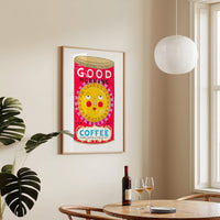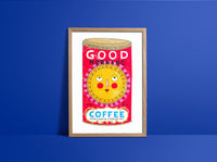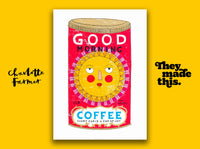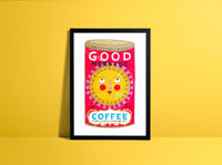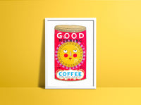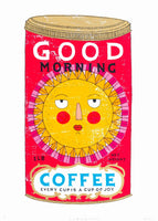 A bright and cheery hand made screen print of a coffee tin, featuring a glowing sun - guaranteed to wake you up in the morning and keep you smiling all day.