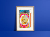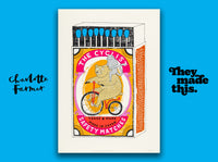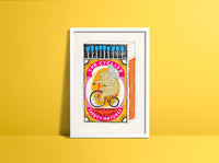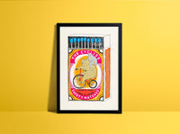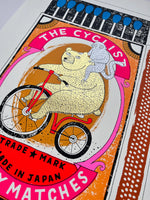 A handmade screen print of a big gold bear on a tiny red bike, with a little silver monkey hitching a ride on the bear's shoulder...(not sure that the bear is too pleased) - all on an illustrated matchbox.