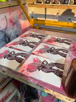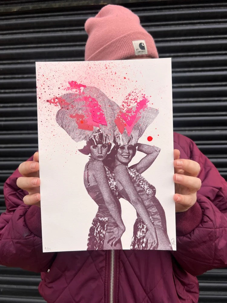 Beautiful deep burgundy screen print hand finished with peach and pink swooshes and neon splats.